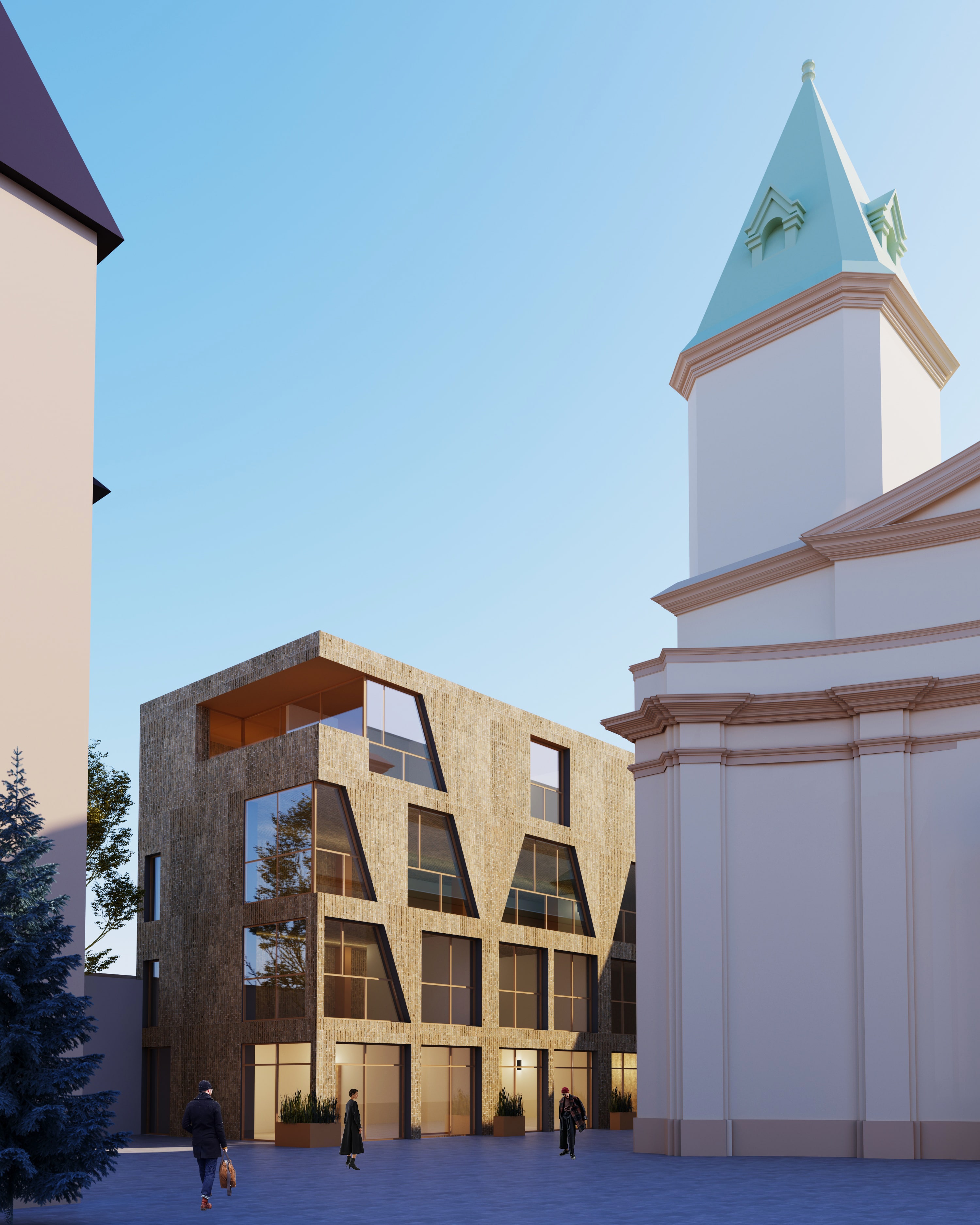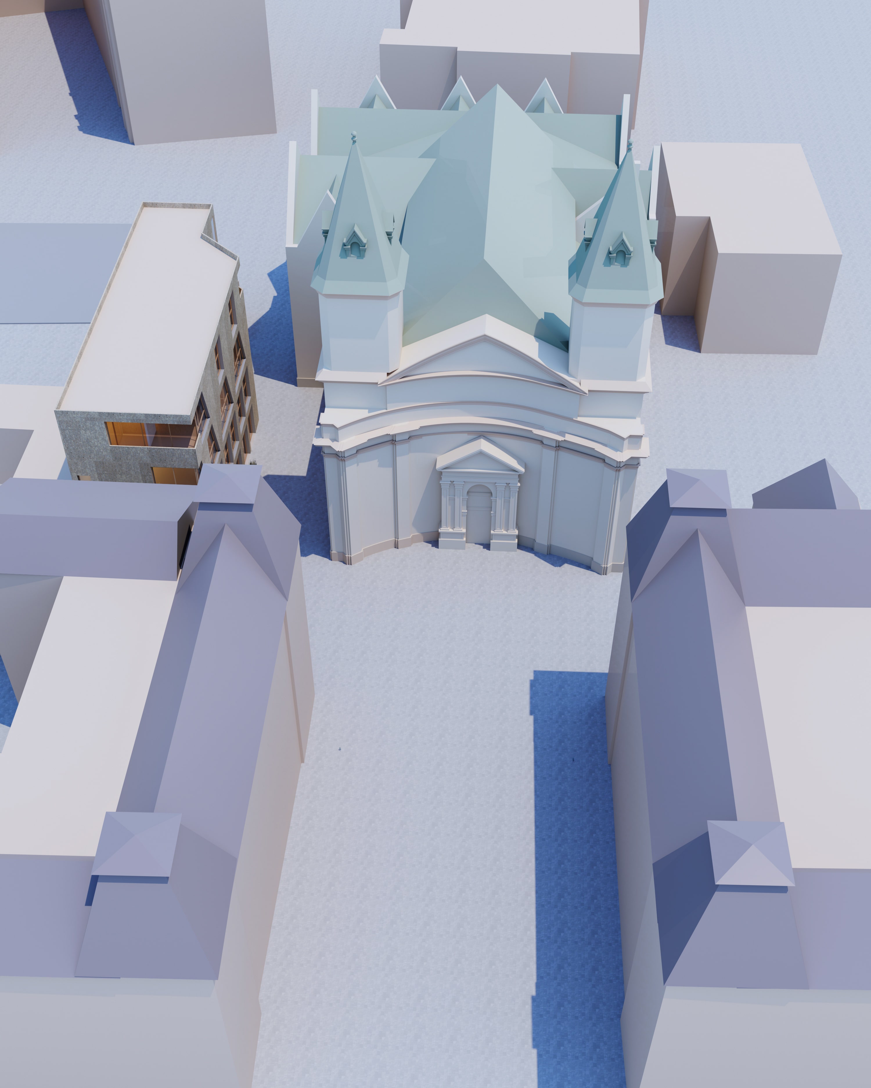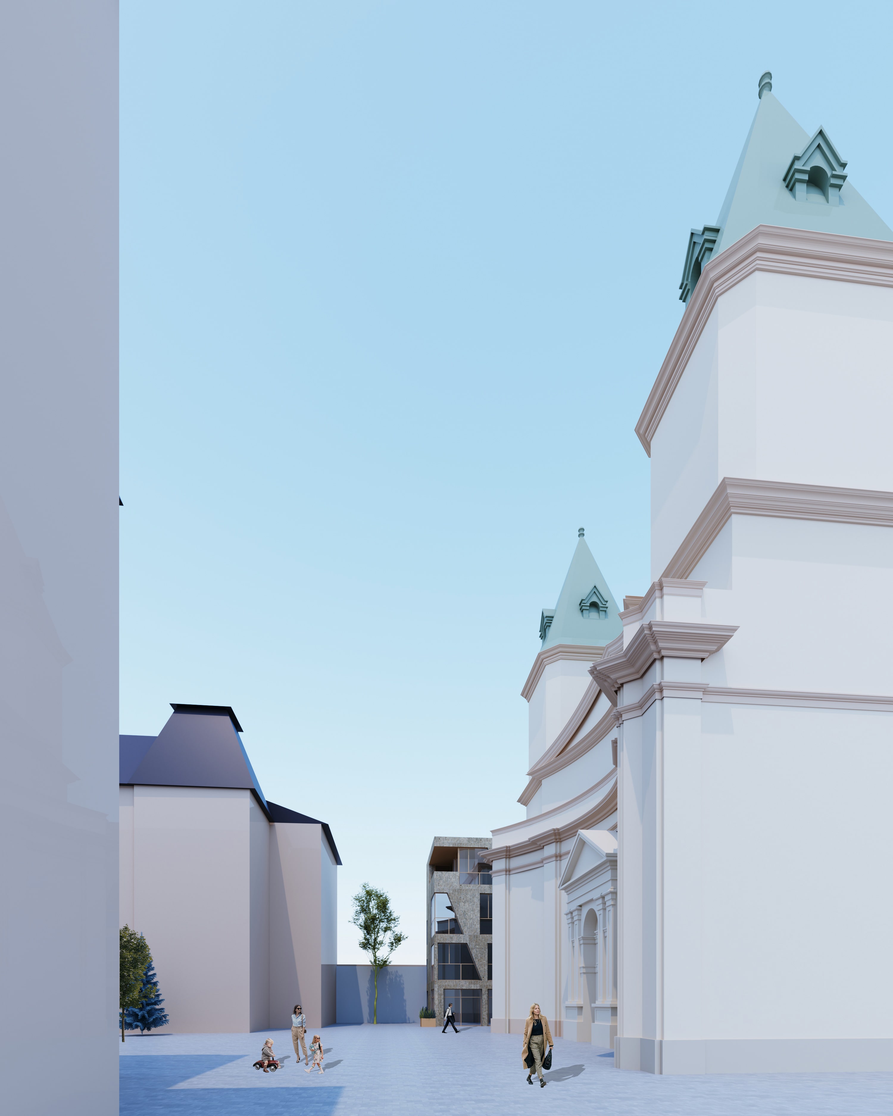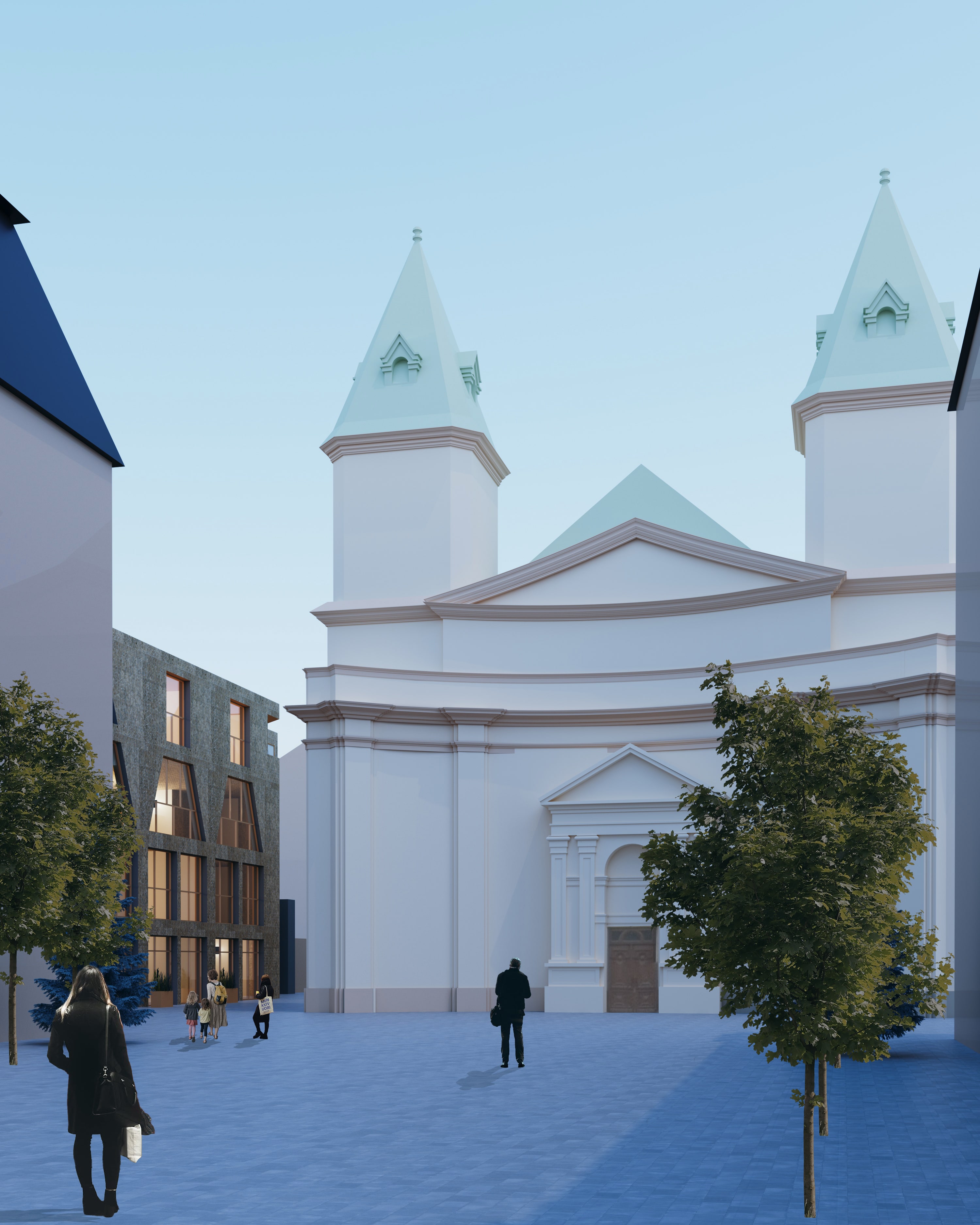 The restoration reinstated the Baroque spatial composition while considering later historical layers. Side aisles were fitted with galleries, the choir lofts were enlarged, and new roof structures were built over the main volume and towers. The Sunday school was added to the northern façade of the Church of St. Ursula. The balanced and well-proportioned volume of the school, corresponding in scale to the Evangelical school and the pastor’s house, embraces the apse of the church.