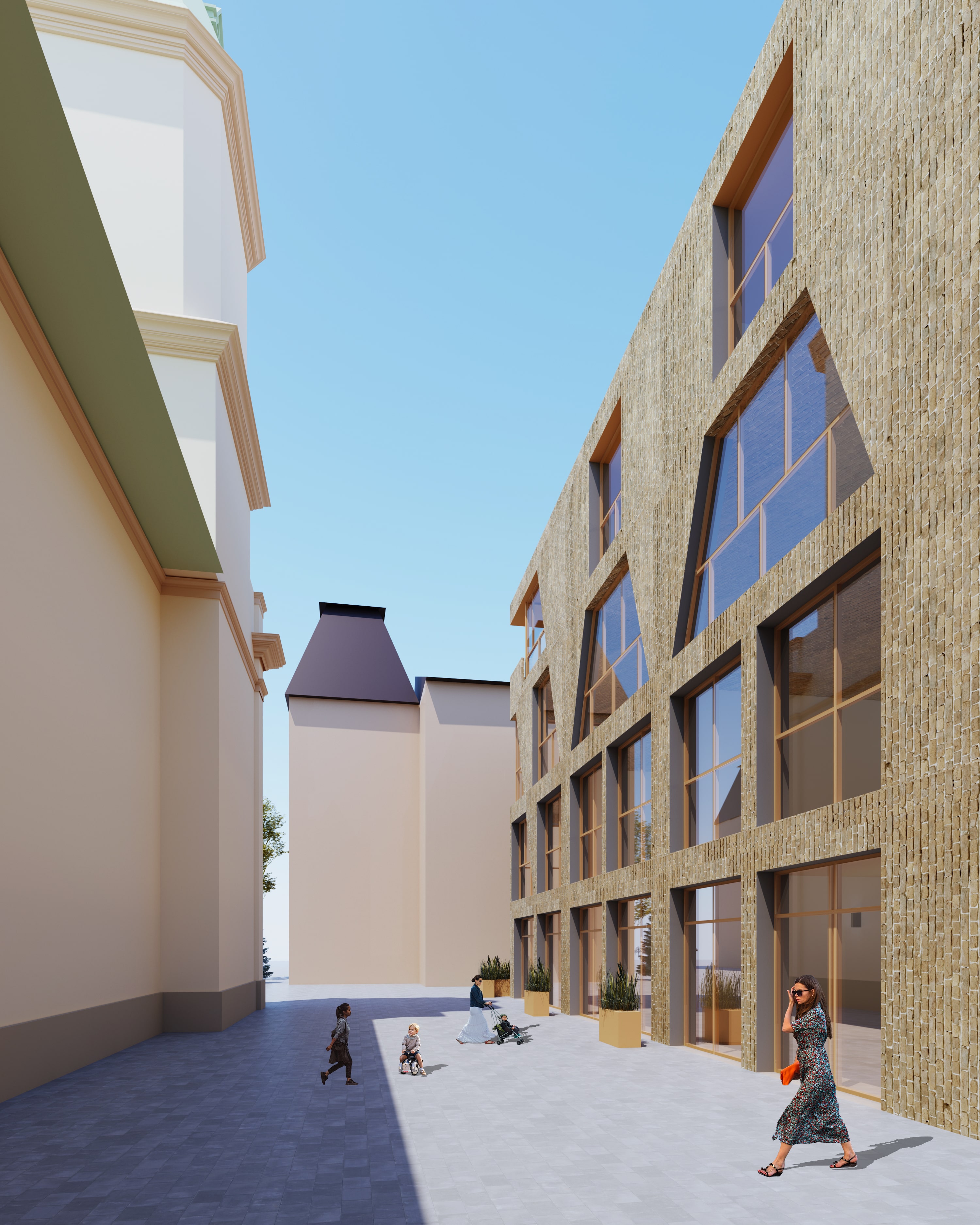 The reconstructed building is designed with a flat roof; the absence of gables and a high roof is compensated by the graphic treatment, form, and composition of the windows.